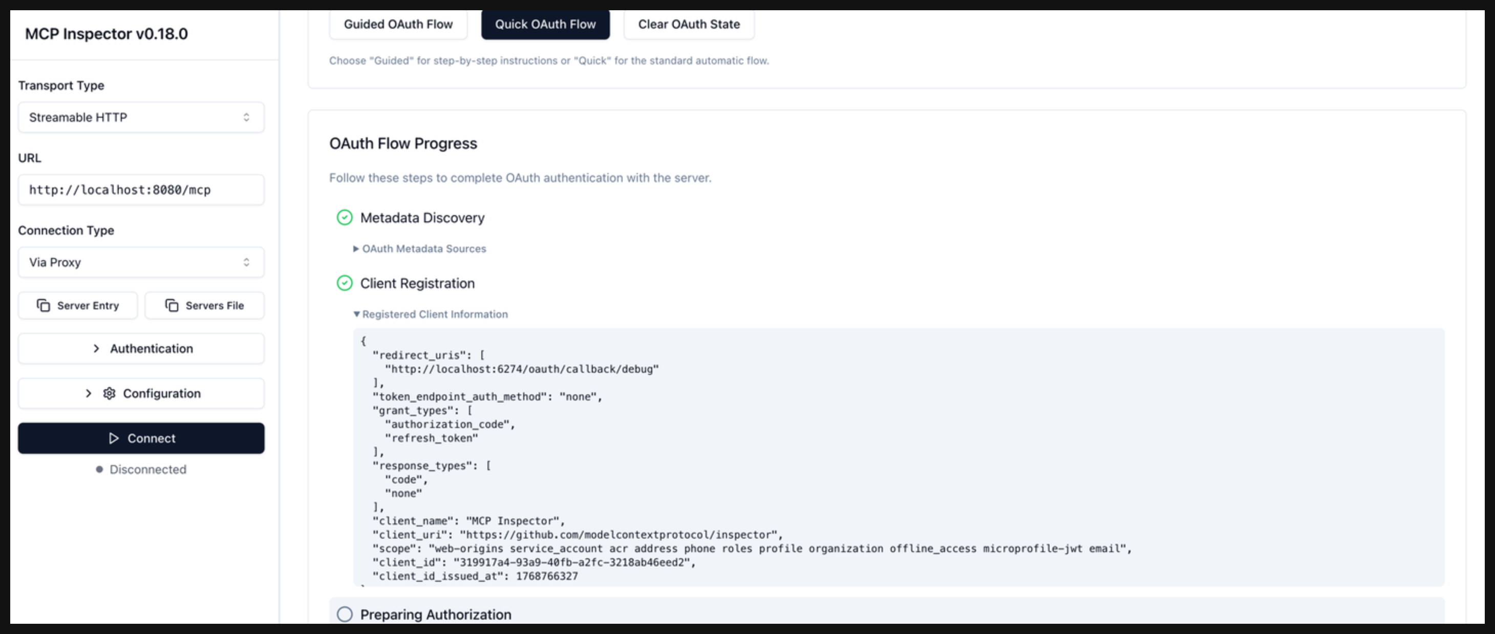 Click Continue to start the Client registration phase. Verify that the MCP inspector tool successfully registered as a client in Keycloak and is assigned a client ID.