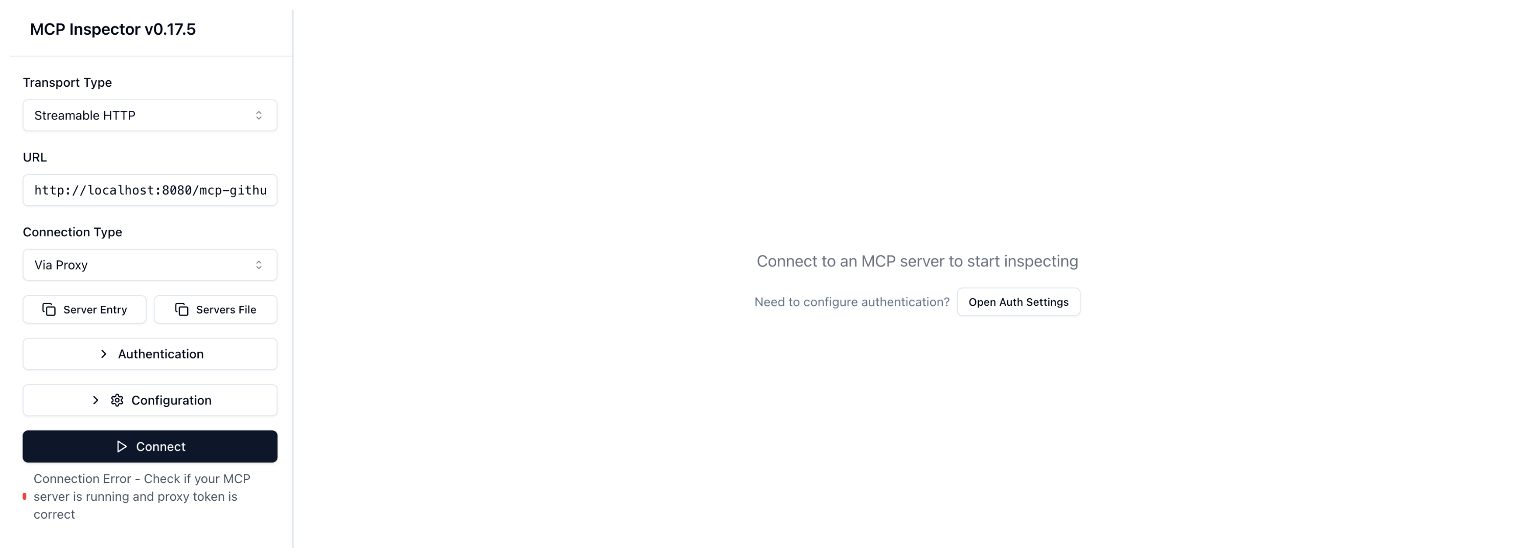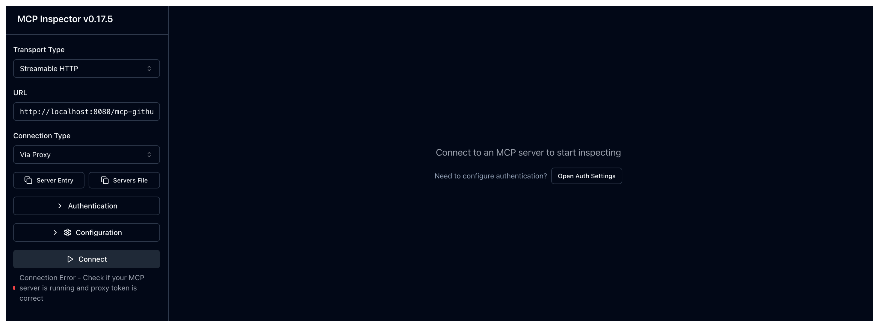 From the terminal, run the MCP Inspector command. Then, the MCP Inspector opens in your browser. If the MCP inspector tool does not open automatically, run