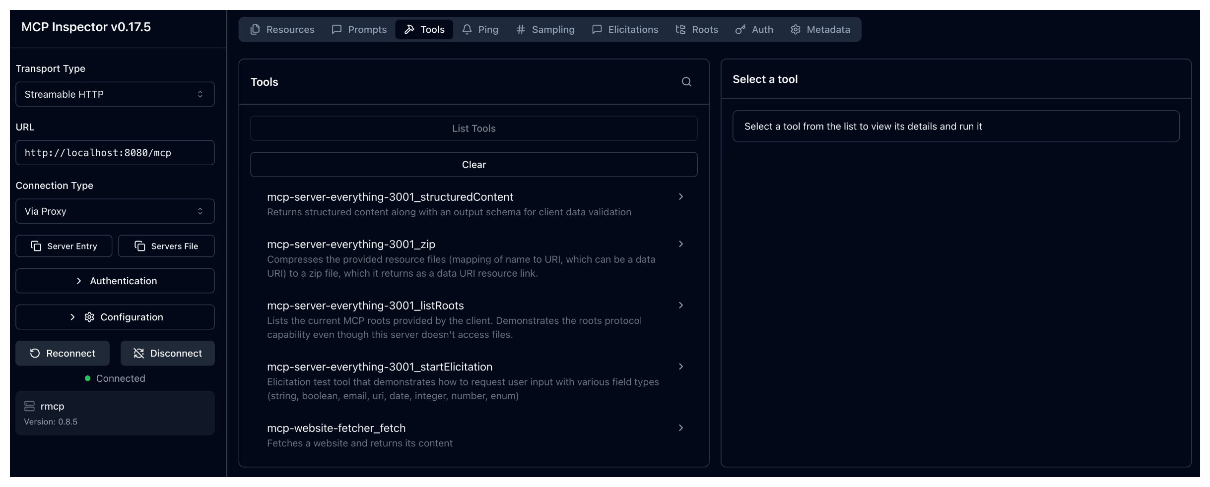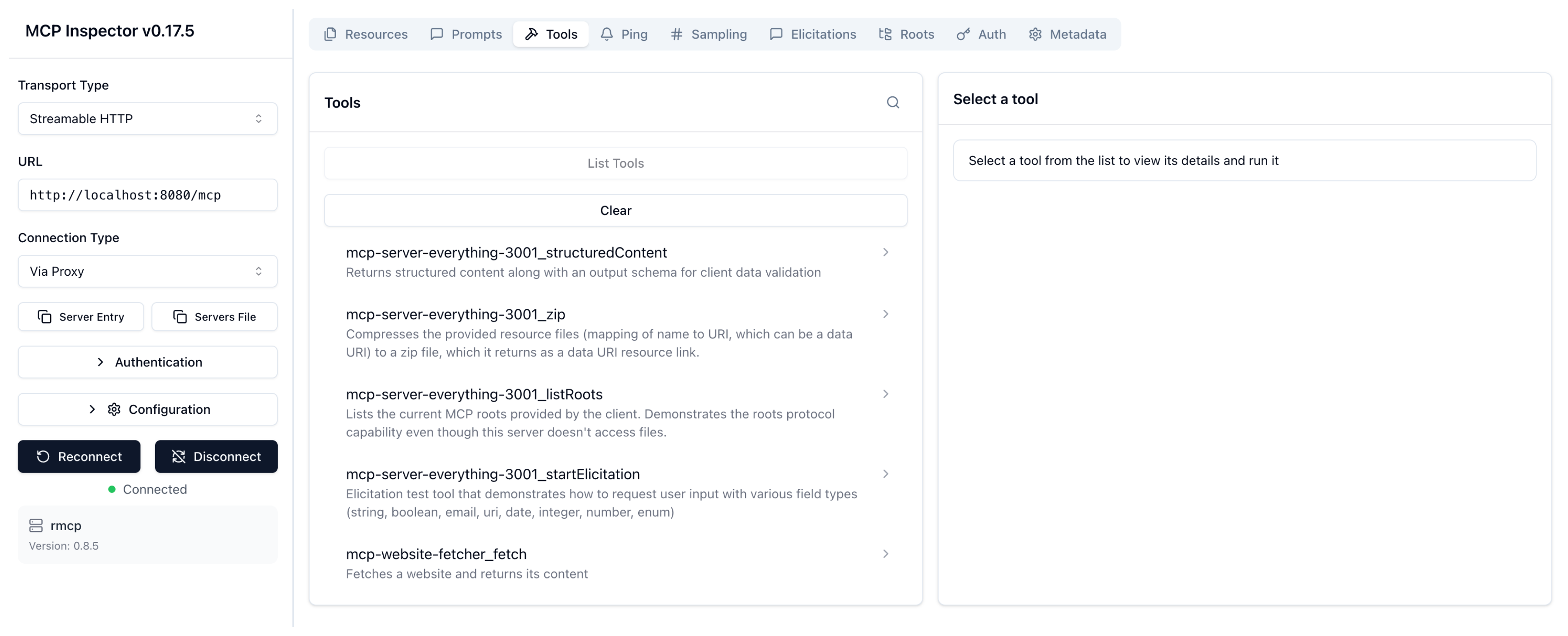 • Test the mcp-server-everything-3001_echo tool: Click List Tools and select the echo tool. In the message field, enter any string, such as Hello world, and click Run Tool. Verify that your string is echoed back.